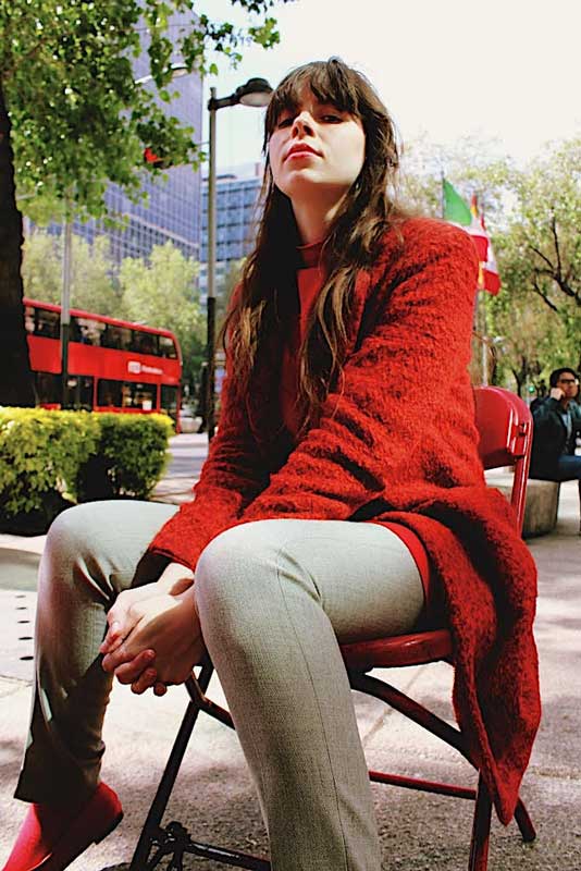 Frente al lente de la cámara, la asidua lectora de Sylvia Plath adopta gestos serios que contrastan con lo risueña que resulta al hablar. Le resulta curioso un puesto de bolero y pide una foto ahí. Antes había posado al lado de una caseta de teléfono.