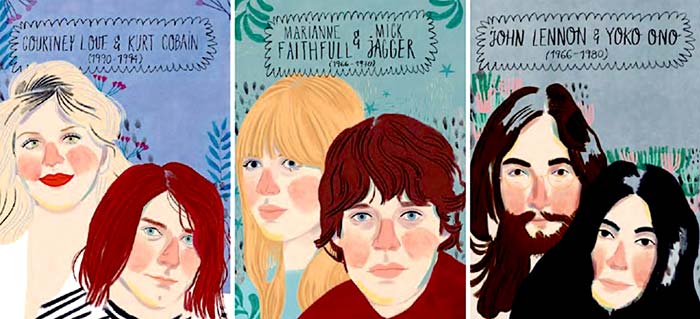 Pues de todo eso nos cuenta (¿o nos chismea?) Marisa Morea con sus encantadoras ilustraciones y sus amenos e irresistibles textos. De ese modo nos enteramos, por ejemplo, de cómo fue que Patti Smith se casó en 1980 con el guitarrista Fred “Sonic” Smith, guitarrista del subversivo grupo de Detroit MC5, y de cómo por ocho años ella dejó la música para dedicarse a criar a sus dos hijos como toda una madre convencional o, yéndonos más atrás, Morea nos narra el breve pero apasionado crush entre Jim Morrison y la cantante alemana Nico, sus experiencias erótico-artísticas en el desierto de California, mientras consumían peyote y escribían canciones y cómo ella se pintó el cabello de color encarnado para tratar de retener al vocalista de The Doors y que no regresara con su novia, Pamela Courson, una pelirroja natural.