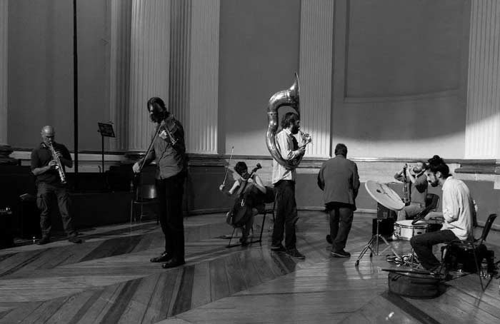 La siguiente intervención la hacen los nueve en pleno, pero no deja de tener algo de extraño. Wilfrido Terrazas desde el fondo utiliza unos pequeños platillos para generar sonidos; Ramón del Buey echa mano de técnicas extendidas, al tomar su clarinete bajo; Natalia Pérez Turner, Fernando Vigueras y Darío Bernal permanecen en su sitio, pero Misha Marks, Alexander Bruck, Sarmen Almond y Remi Álvarez comienzan a moverse. Al principio son movimientos cautelosos, dubitativos, pero una vez que encuentran su ritmo, llegan a un vals, se trasladan de un extremo a otro y esas transiciones de espacio, esa rotación constante que llevan a cabo, crea vaivenes de sonido, capas que se entremezclan y lo que surge de esa comunión es lo más interesante de la tarde, la comunicación más fructífera gestada, 15-20 minutos en los cuales la interrelación de los nueve es total y alcanza las cuotas artísticas más altas y confirma a Generación Espontánea como uno de los ensambles de improvisación-vanguardia más interesantes del país.