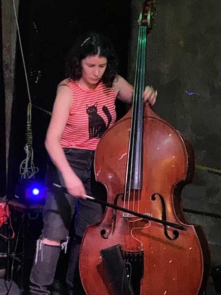 Mientras eso sucede, Adriana Camacho percute su contrabajo, lo “maltrata”; sus dedos se mueven con velocidad e imprimen fuerza al sonido. Cuando se “cansa”, toma el arco y frota las cuerdas, las golpea, le tiende ideas a Cravioto quien, desde su batería, responde y tal vez no sea tan espectacular en sus respuestas, pero sí que ha ido ganando seguridad conforme avanza la presentación. Desde uno de los extremos Sarmen Almond juega, gimotea, susurra, grita con su voz, la despliega como ese instrumento que ha desarrollado en años y el todo crece, crece en intensidad, alcanza picos y baja para encontrar una sima –en medio de ésta, de manera surrealista, la gritería y la música del piso superior se cuela– preparatoria para la búsqueda de un nuevo clímax: ¿podrán superar lo alcanzado hace unos minutos?