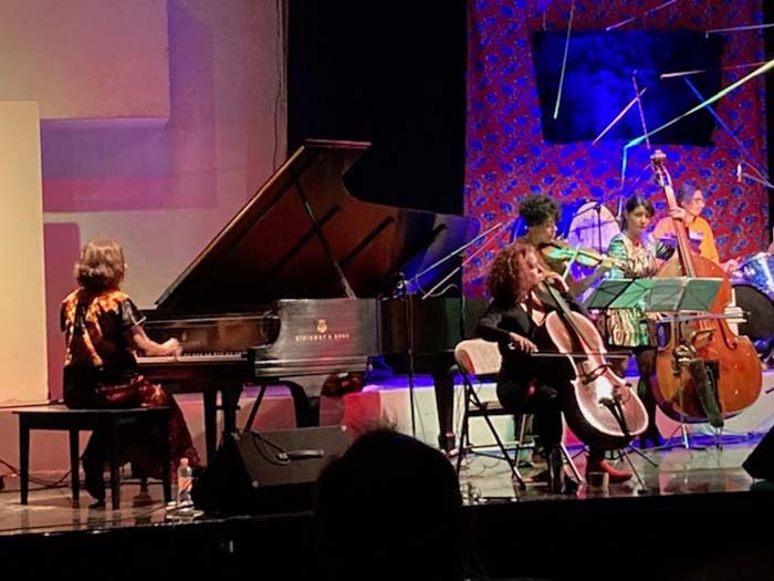 Sí, pero una cosa es que te digan o adviertan de lo venidero y otra es que ello te dé un indicio de la magnitud del golpe y cuando el noneto comandado por la pianista comienza a sonar (la ya mencionada Naima Karlsson, piano; Maricarmen Graue, cello; Alda Arita, trompeta y guitarra; Adriana Camacho, contrabajo; Alina Maldonado, violín; Cipriano Izquierdo, flauta y voz; Max Manzano, trompeta; Carlos Icaza, batería; Xristian Espinoza, saxofón), el cuerpo de la música se agiganta; es un sonido robusto y rotundo que cubre todo y no deja resquicio alguno, lo envuelve con amabilidad bajo su aura y ya no lo soltará.