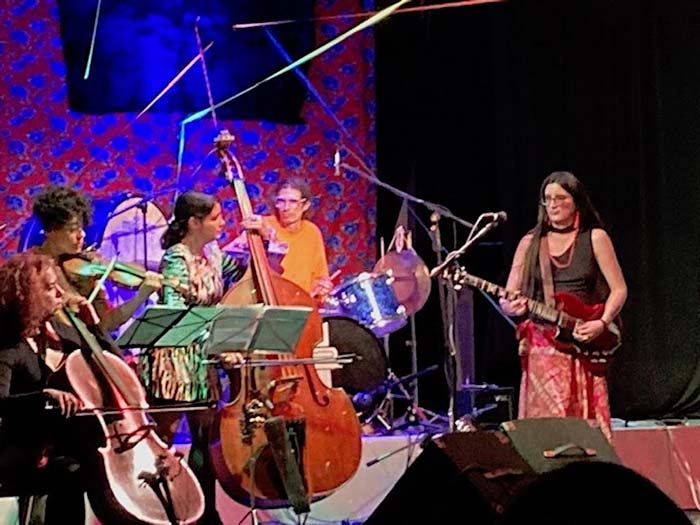 Por momentos Alina Maldonado rasga con fuerza las cuerdas de su violín, habla con el cello de Maricarmen Graue y ese diálogo inicial se torna agradable conversación cuando se agregan las otras cuerdas, las de Adriana Camacho. A Alda Arita le toca imprimir la fortaleza con sus solos de guitarra, pocos, pero colocados en el momento justo cada uno de ellos; Icaza, en la batería, Espinoza en el sax, también se prodigan, aportan lo suyo a un trabajo comunitario al servicio de las composiciones. La música, al sentirse tratada obsequiosamente, se deja llevar y conducir para beneplácito de los mismos intérpretes, quienes en distintos momentos de la noche dan señas de gozo y alegría que redunda en beneficio de los presentes.