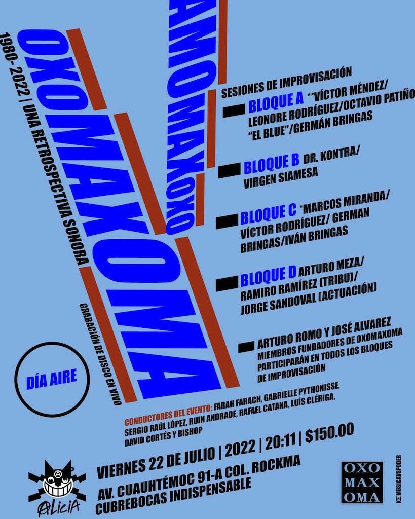 Oxomaxoma, 1980-2022. Una retrospectiva sonora, 21, 22 y 23 de julio, a partir de las ocho de la noche, Foro Alicia (Av. Cuauhtémoc 91-A, Col. Roma).