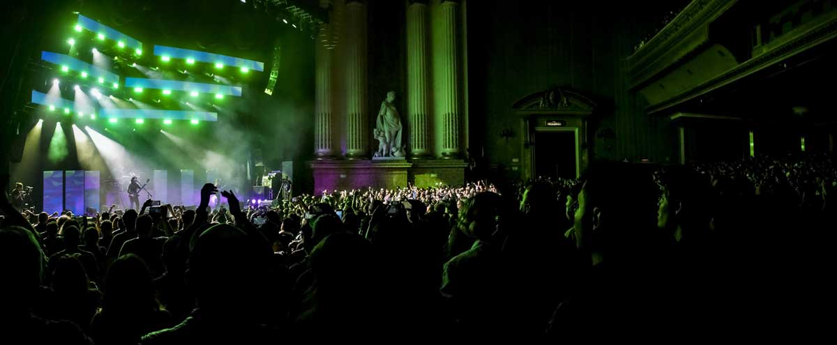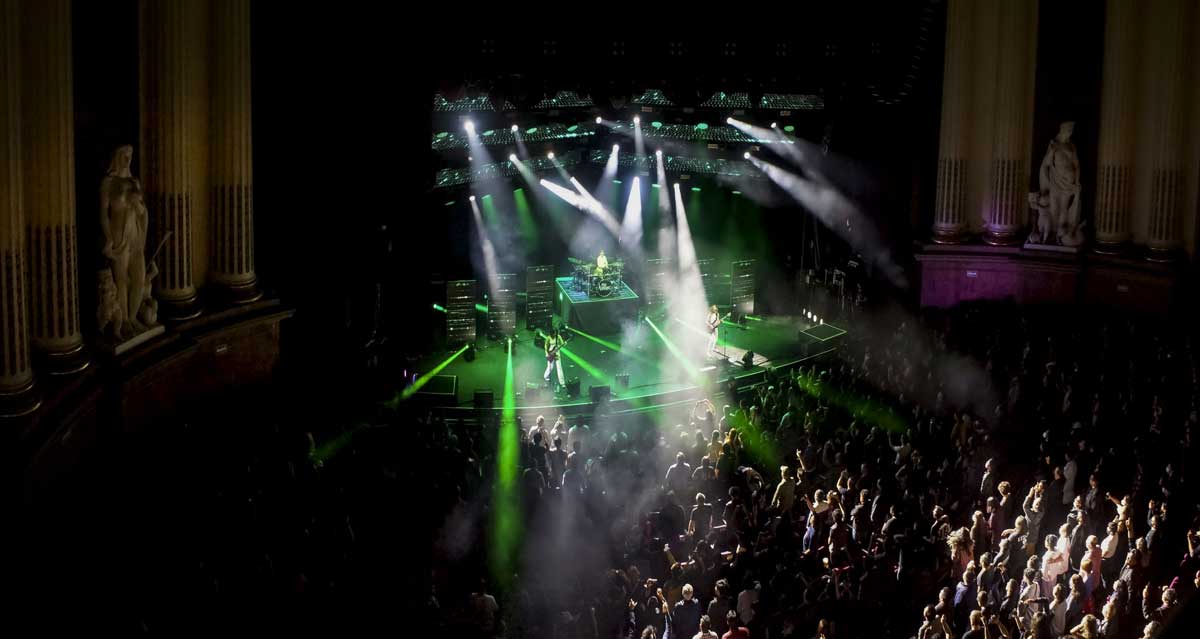 Pero la emoción emo (válgaseme la licencia) tornó en entusiasmo absoluto con la popularísima “Survive”. Si la gente había coreado en todas las canciones, aquí el “Ooooh, uo-ho-ho, ho-ho” se volvió masivo y los saltos de los presentes pusieron a retemblar al solemne recinto con todo y sus grandes estatuas neoclásicas. Brazos en alto, celulares que trataban de grabarlo todo y voces despreocupadamente desafinadas de un público completamente eufórico. Vendría de inmediato otra favorita del disco Error, esa crítica irónica al totalitarismo y la manipulación de masas que es la implacable “Disciple”. La temperatura seguía en elevación plena, pero de pronto…