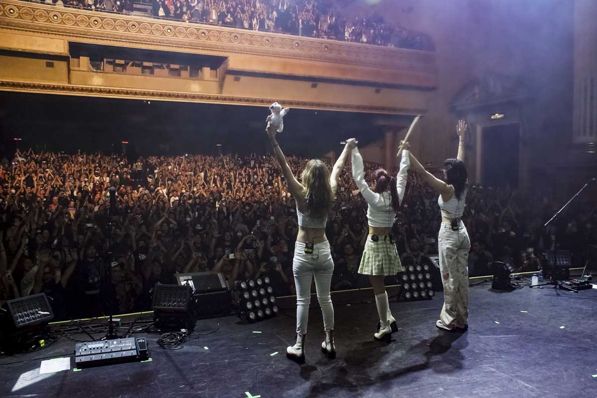 A partir de ahí, no hubo manera de detener el vendaval sonoro que inundó al Metropólitan. Cada canción del set list era recibida como si se tratara del mayor éxito del grupo. Así sucedió con “Animosity”, las viejitas “Queen of the Murder Scene” y “Ugh” o la flamante “Amour”, con su interludio en perfecto francés. La intensidad subiría un peldaño más cuando Daniela anunció “Enter Sandman”, ese clásico de Metallica y del metal del que The Warning, acompañado de la cantante canadiense Alessia Cara, realizó un cover extraordinario para el kilométrico álbum de cinco discos con el que el cuarteto de San Francisco celebró los primeros treinta años de su llamado álbum negro. Sin la Cara presencial aunque con su voz grabada, las tres regiomontanas realizaron una versión tan potente como memorable que dejó a la gente más encendida aún. Luego vinieron otras dos piezas ya infaltables del primer repertorio del trío: la poderosísima y vertiginosa “Dull Knives (Cut Better)” y la emótiva y entrañable “When I’m Alone” (canción absolutamente de Daniela) que se remonta al 2017 en que grabaron el disco XXI Century Blood.
