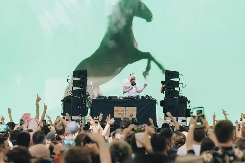“I walk, I trout, I gallop”. Curioso, pero se volvió un mantra este tema en mi cabeza durante todo el festival y a día de hoy. Precisamente, el happy hardcore, el gabber, la socarronería escénica, todo eso me taladraba el cerebro y me marcó como marcan a un caballo. Esa línea socarrona fue lo que protagonizó y predominó las primeras horas de la tarde del Sónar de Día. Vaya establo loco fue el Village con la artista berlinesa horsegiirL, productora y DJ que se presentó ataviada con un vestido blanco de gasa espantoso, hombreras exageradas y portando una careta de caballo con peluca rubia, bajo la cual se escondía un rostro anónimo femenino. Horrible y a la vez fue la sensación absoluta de la tarde. Suficiente para acercarme al género que menos me interpela, el happy hardcore.