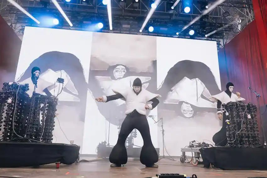 Mismo escenario y horario principal. Visuales poco favorecedores y fumando un cigarrito tras otro en blanco y negro y en primer plano, haciendo muecas raras propias de alguien que ejecuta algo en directo. Kalkbrenner es el primer DJ club mainstream de la historia. Vuelve con papel protagónico. Su aproximación al show fue la misma que en 2019: varias cámaras que en todo momento apuntaban a su cara y a la mesa de mezclas. En comparación con la visita de cinco años atrás, hubo menos presencia del disco Parts of Life recién sacado en ese momento. Fueron certeros sus icónicos remixes de “Te Quiero” y “White Rabbit”. Qué decir de su himno generacional, el archiconocido “Sky and Sand”.