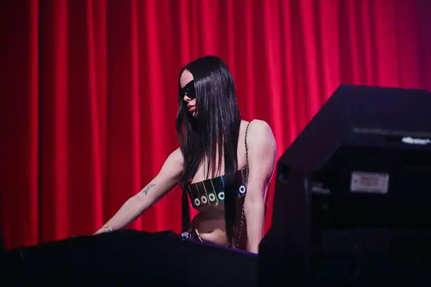 Todo el festival permaneció con la broma de buscar cringe, concepto que veríamos materializarse a las seis de la mañana con el show de Virgen María y BLEX. Cringe, sí, pero también híper estimulante y con el club deconstruido y hasta reterritorializado. Gabber, electrodance, hardcore y sonidos rave insoportables. Una morsa sirena que menea al compás su cola mientras mezcla. Video performance que parecía hacer vanguardia a lo Luis Buñuel. Absoluta locura. Un plus, la voluptuosidad desnuda de Virgen María. Todo muy raro y adictivo. BLEX, fundado por Virgen María y Naive Supreme, es un colectivo queer, radical, con talento brutal en toda la literalidad de la palabra. A él se sumaron “el infame artista digital” Filip Custic y el DJ y productor “del que no puedes quitar la mirada” Hundred Tauro. Nunca olvidaré su cola de manatí echada sobre la mesa, con su consola y aleteando al compás de los beats más locos, me moría de la risa. Fue un performance provocador, con mis tímpanos llevados al extremo y mezclas únicas entre pop y rave. Entre tanto ruido y personas encontré a la sensual figura de Virgen María, hija de la actriz Verónica Forqué, quien siempre ha tenido una gran querencia por lo esotérico, lo erótico, lo bizarro y lo oscuro. La musa del cringe.